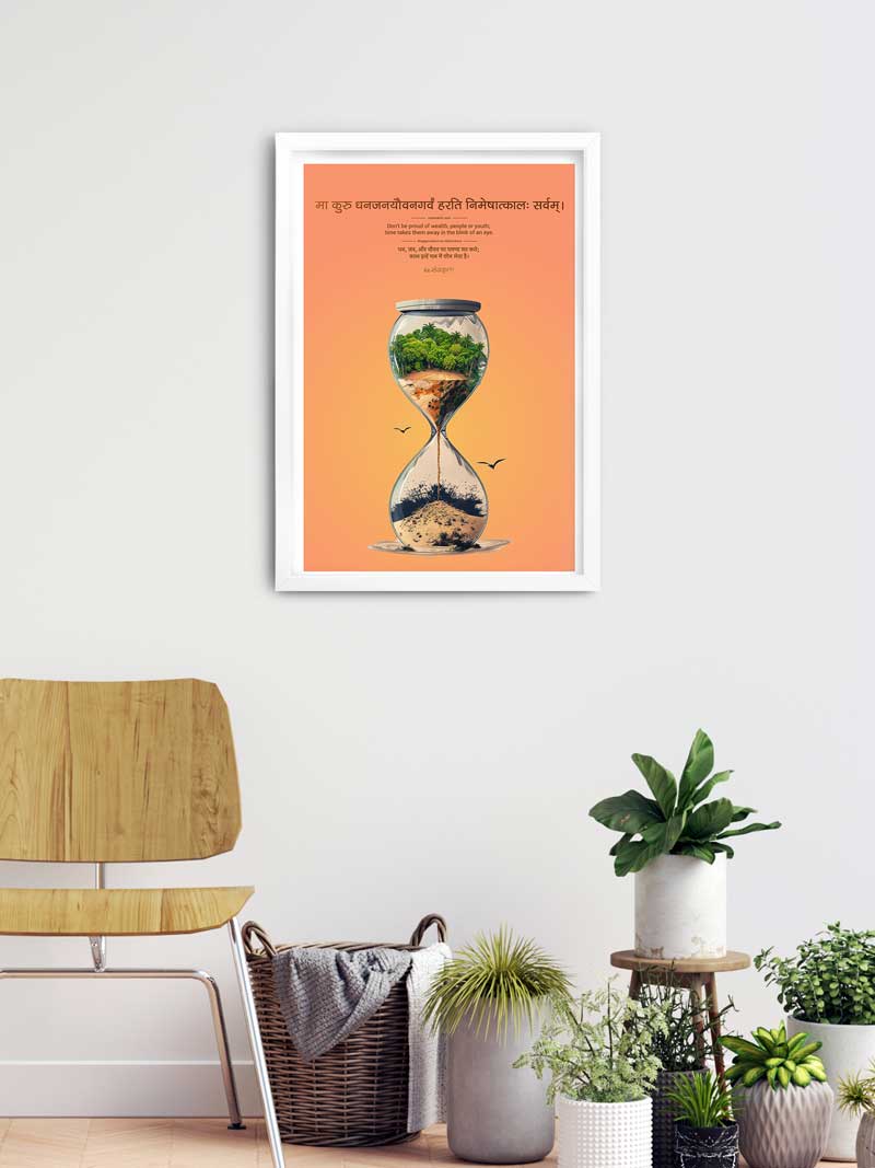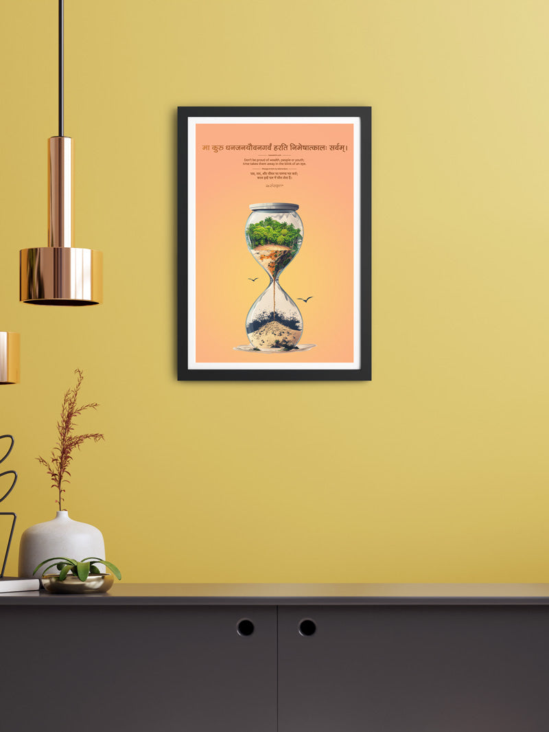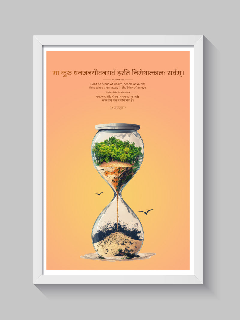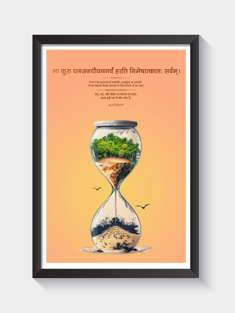 Featuring a powerful Sanskrit verse from Adi Shankaracharya on the fleeting nature of wealth, youth, and people, this frame includes a stunning hourglass illustration symbolizing the passage of time.