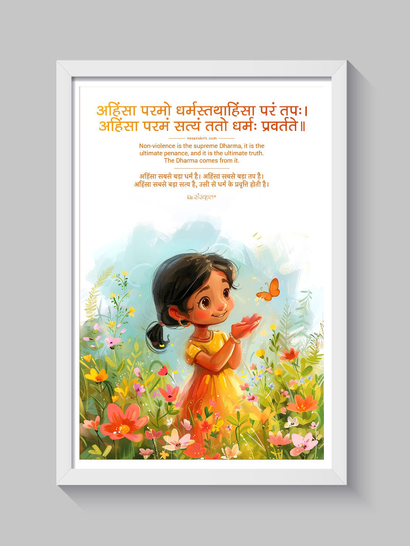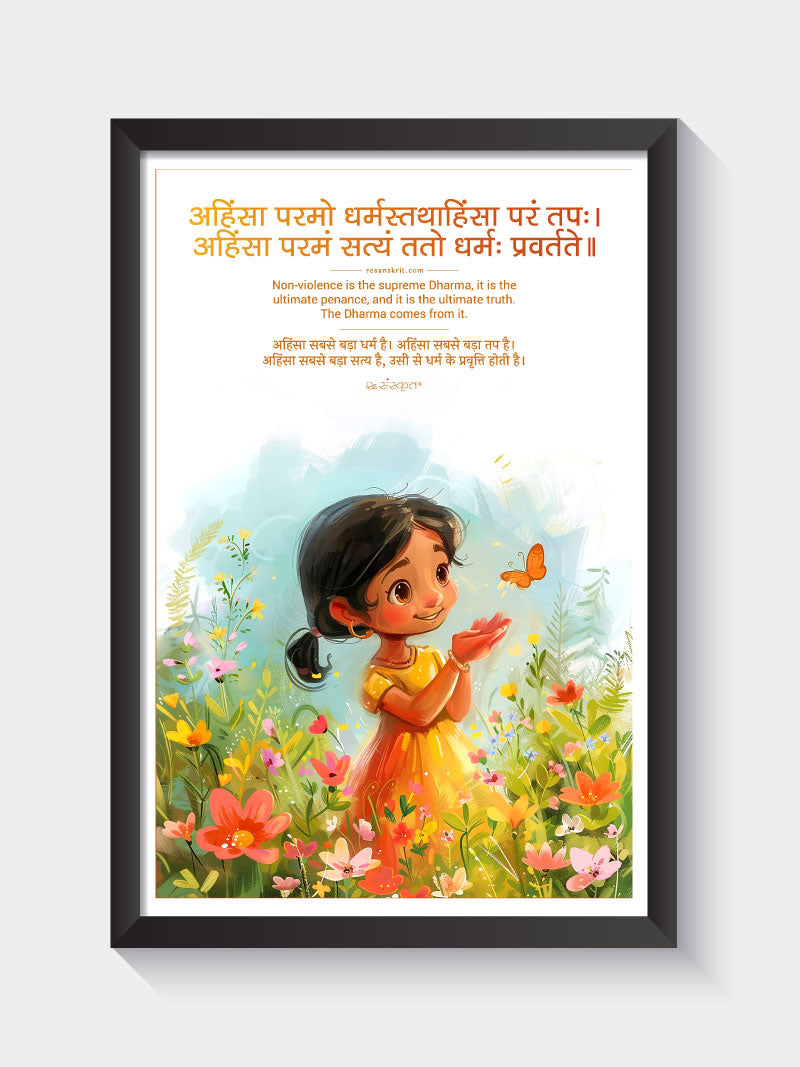 Featuring the powerful Sanskrit verse Ahimsa Parmo Dharma (Non-violence is the supreme Dharma), this frame is adorned with a heartwarming illustration symbolizing peace, kindness, and harmony.