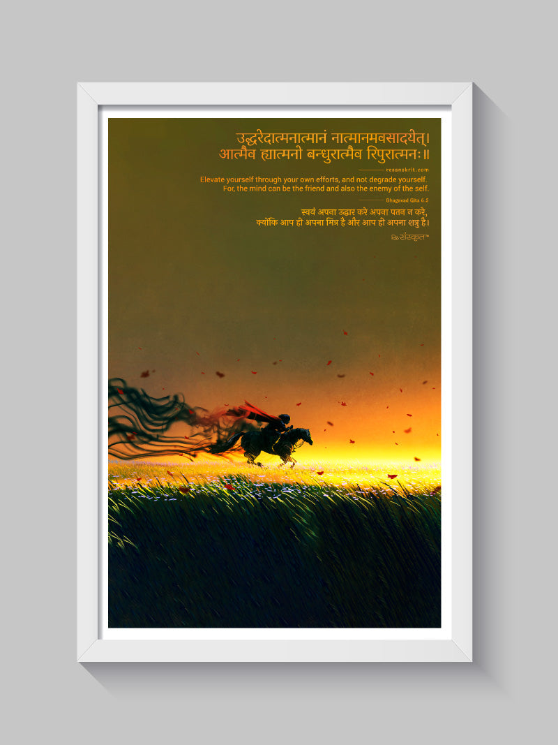 One of the most beautiful quotes from Bhagavad Gita (6.5). Let this poster be a constant reminder that your mind possesses the power to elevate as well as destroy yourself, use it wisely.