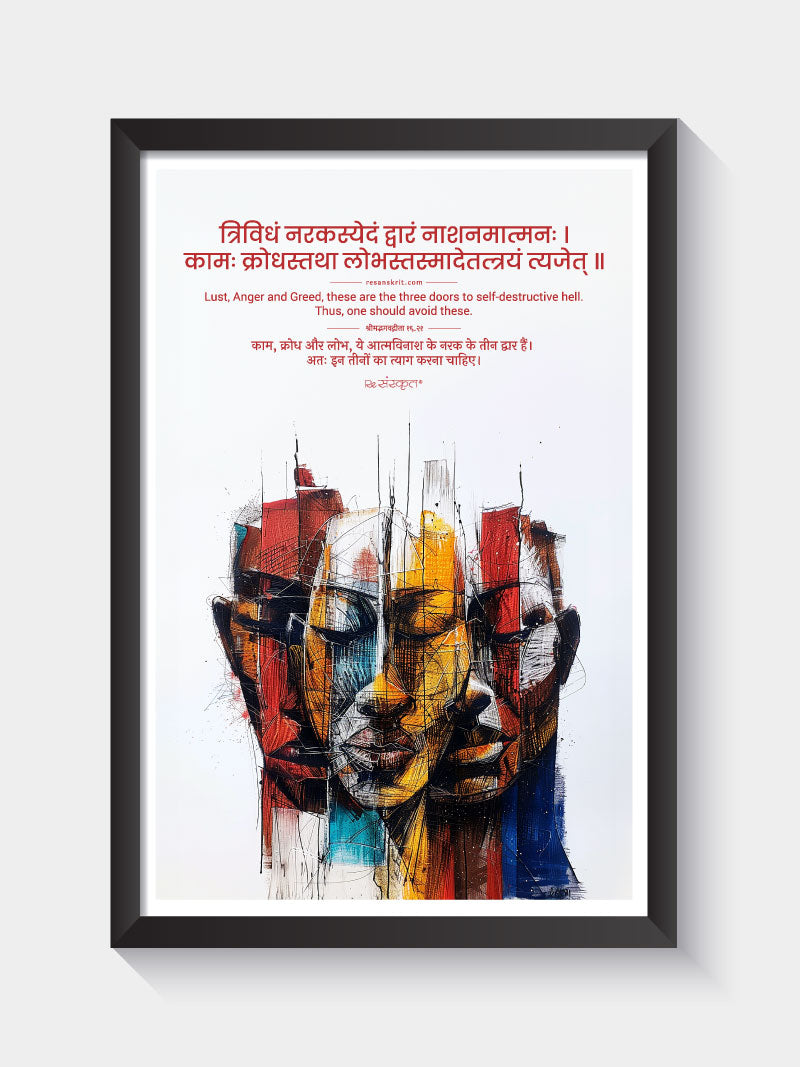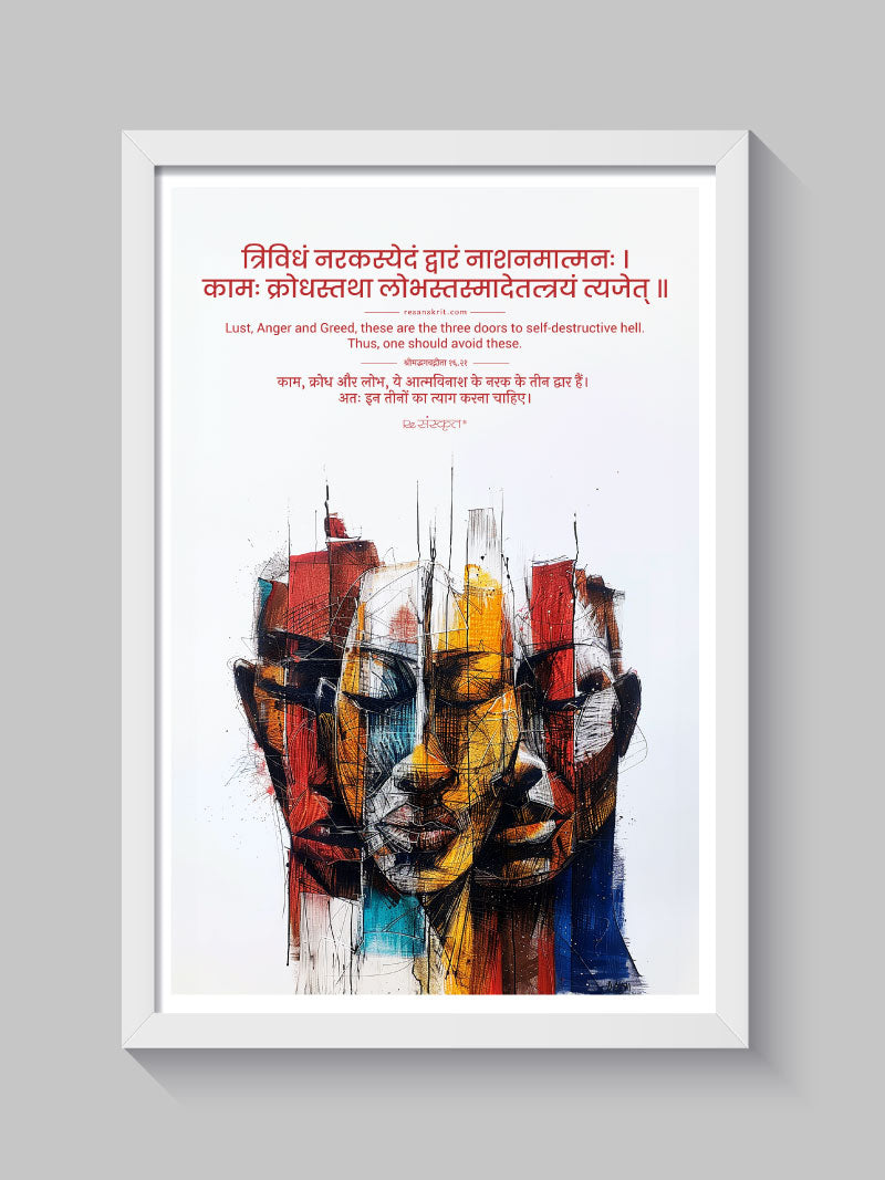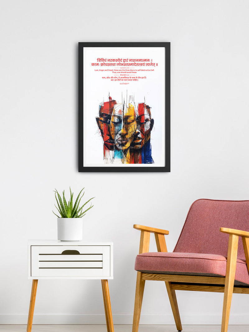 Featuring a powerful Sanskrit verse from Bhagavad Gita on the three gates to self-destruction—lust, anger, and greed—this frame is complemented by a striking abstract artwork symbolizing human emotions.