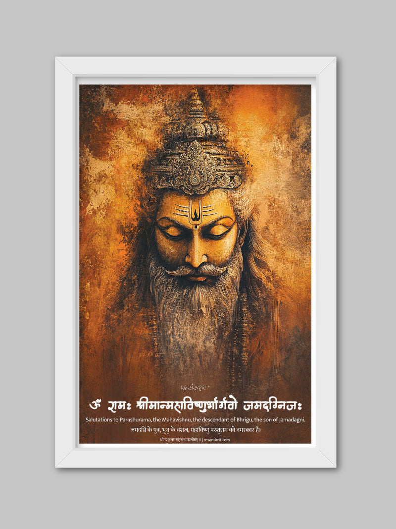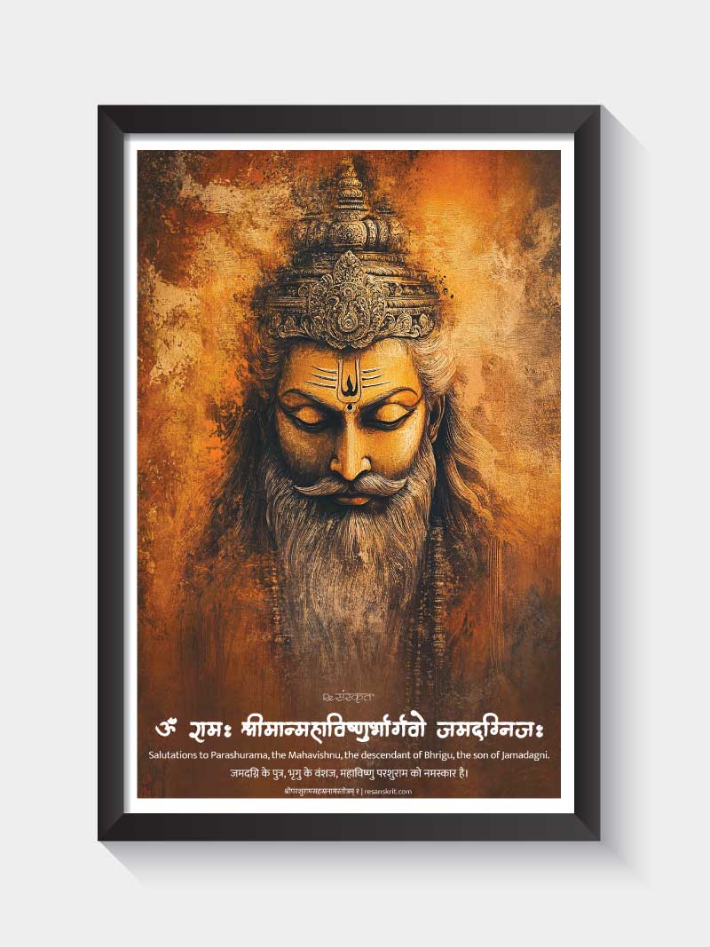 Invoke the power of Bhagwan Parashurama, the warrior incarnation of Vishnu, with this striking frame. The intense artwork, paired with a Sanskrit verse honoring his lineage and strength, makes this a perfect addition for devotees, warriors of Dharma, and spiritual spaces.