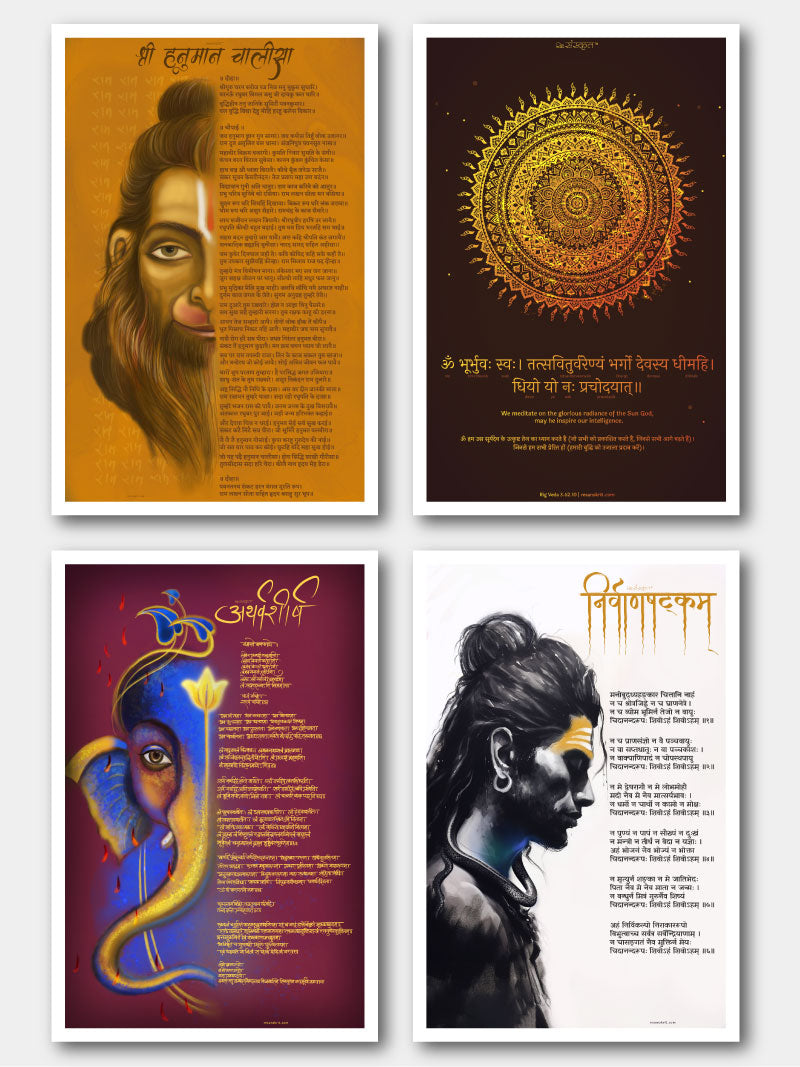 Immerse in divine devotion with this 4-poster combo featuring revered Sanskrit stotras and mantras like Hanuman Chalisa, Ganapati Atharvashirsha, and Nirvana Shatakam. Ideal for home temples and sacred spaces.