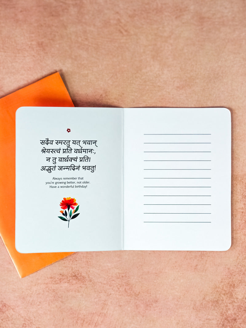 | Inside | Left side features a Sanskrit quote with English translation Right side has ruled lines for your personal message  |