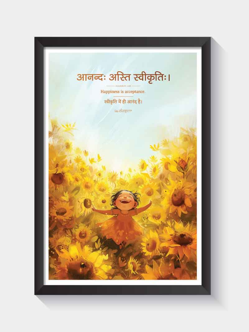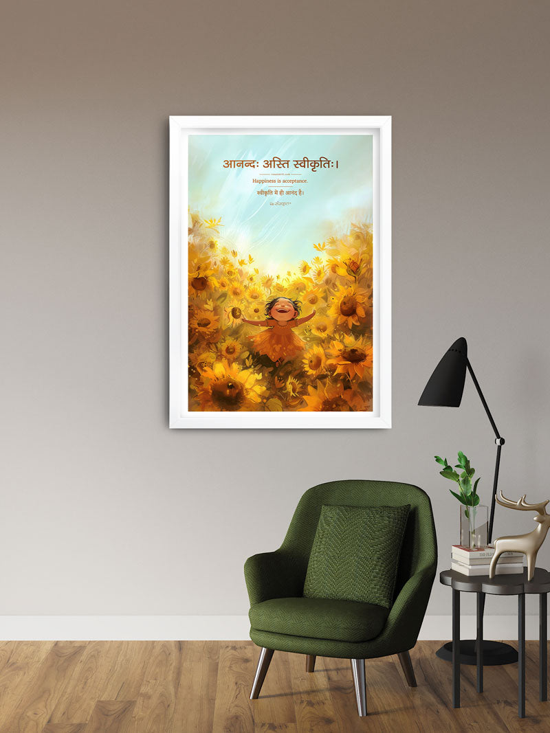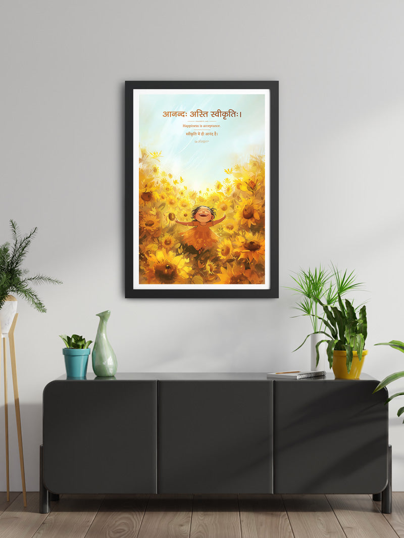 Brighten your space with this uplifting frame featuring a joyful child amidst a field of sunflowers. With a powerful Sanskrit phrase translating to "Happiness is acceptance," this artwork radiates positivity and warmth. Perfect for homes, offices, and mindfulness spaces.