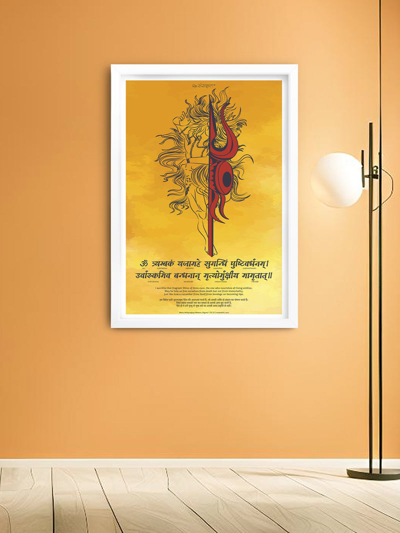 This Maha Mrityunjaya Mantra wall frame with a very apt design featuring Lord Shiva is a great addition to your wall. Maha Mrityunjaya Mantra is one of the most popular Mantras in Sanskrit literature. This is also called a Rudra Mantra or Tryambakam Mantra. Originating from the 7th Mandala of Rigveda, this Mantra is chanted for prosperity, long life, and health.