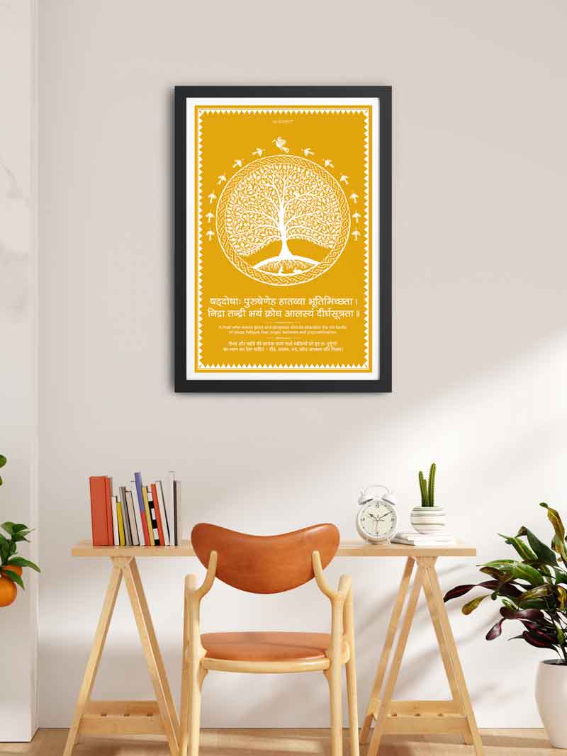 Elevate your living or workspace with this beautifully designed motivational wall art, featuring a traditional tree of life illustration and an inspiring Sanskrit quote from Mahabharat. The quote encourages abandoning the six faults—sleep, fatigue, fear, anger, laziness, and procrastination—to achieve glory and progress. Perfect for those who seek daily inspiration, this wall frame is crafted in earthy tones, adding a serene and motivational touch to any room. Ideal for homes, offices, or meditation spaces.