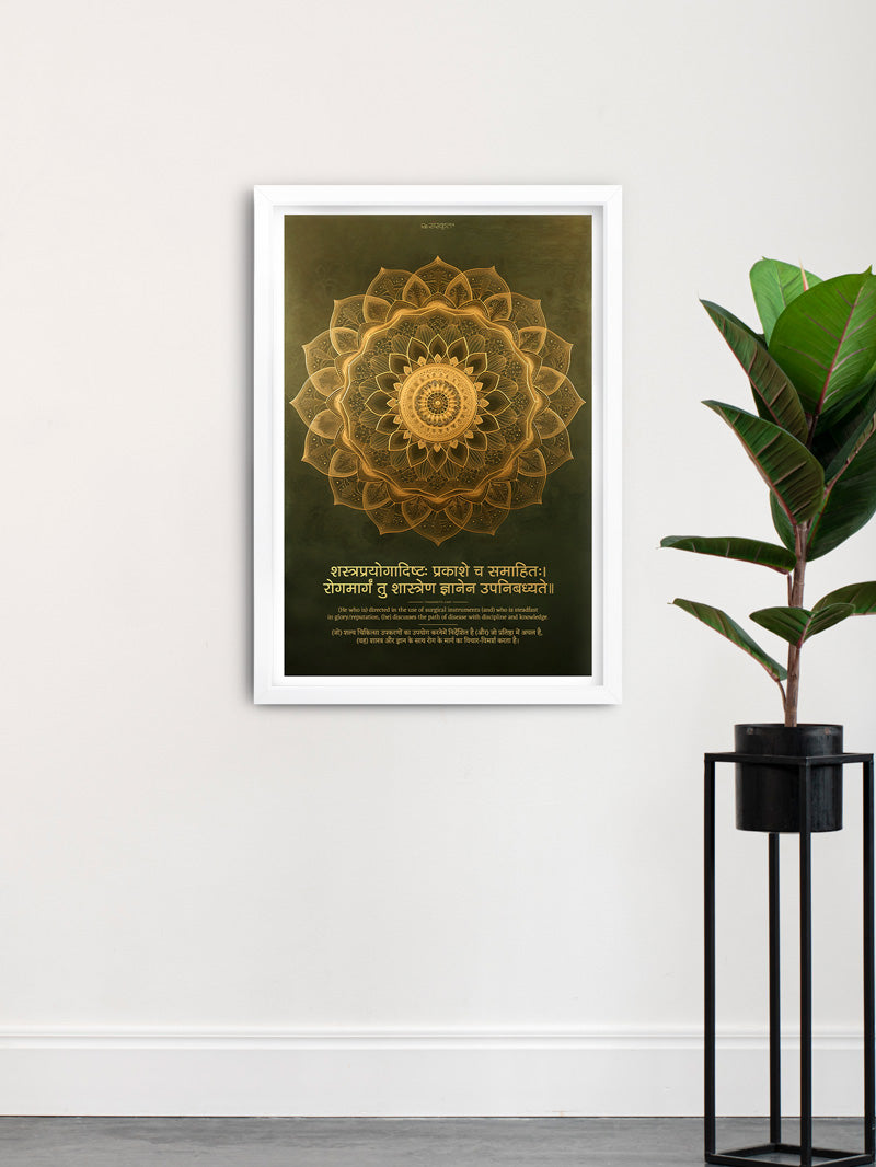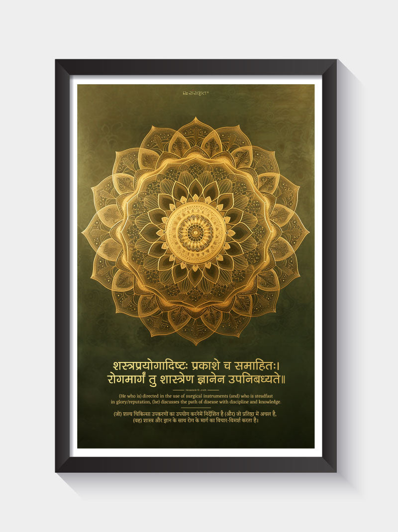 A beautifully designed golden mandala frame featuring a Sanskrit verse celebrating the art of healing and medical discipline, ideal for clinics and hospitals.