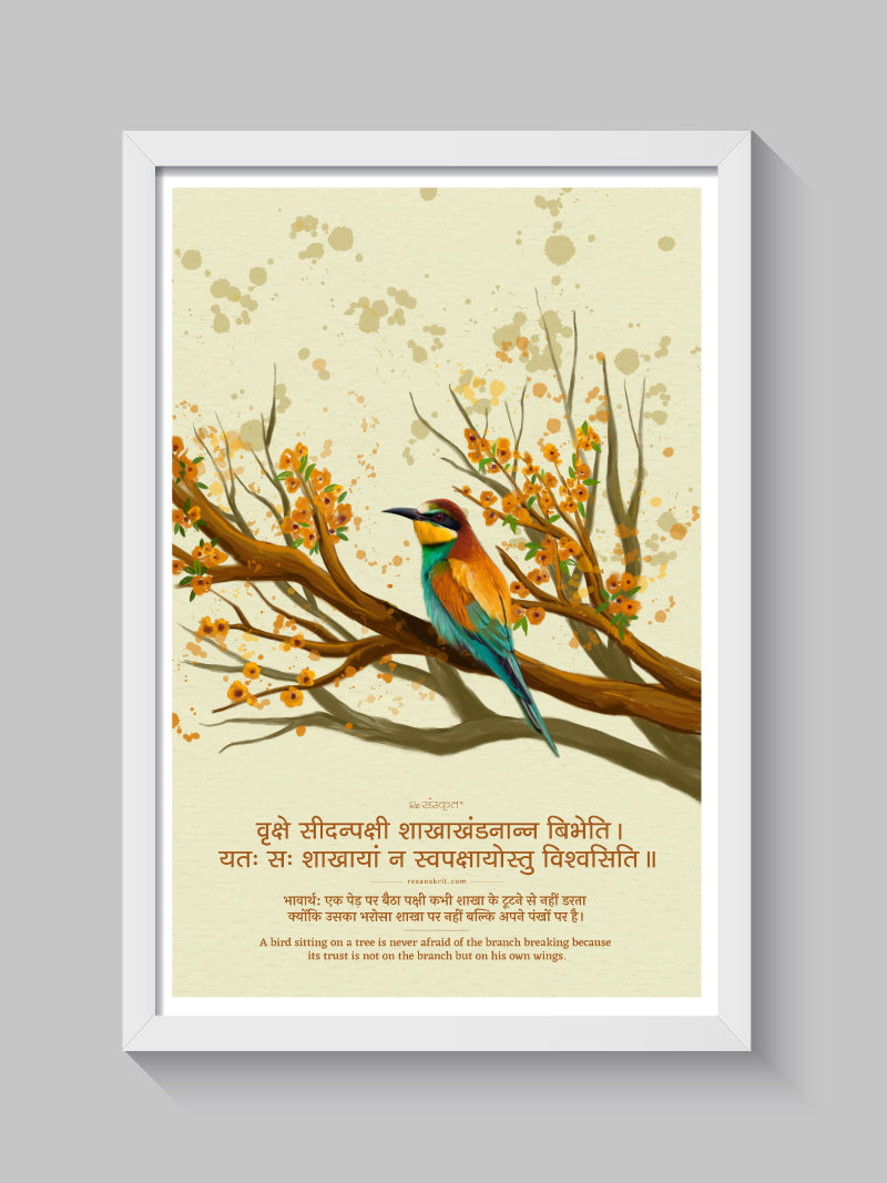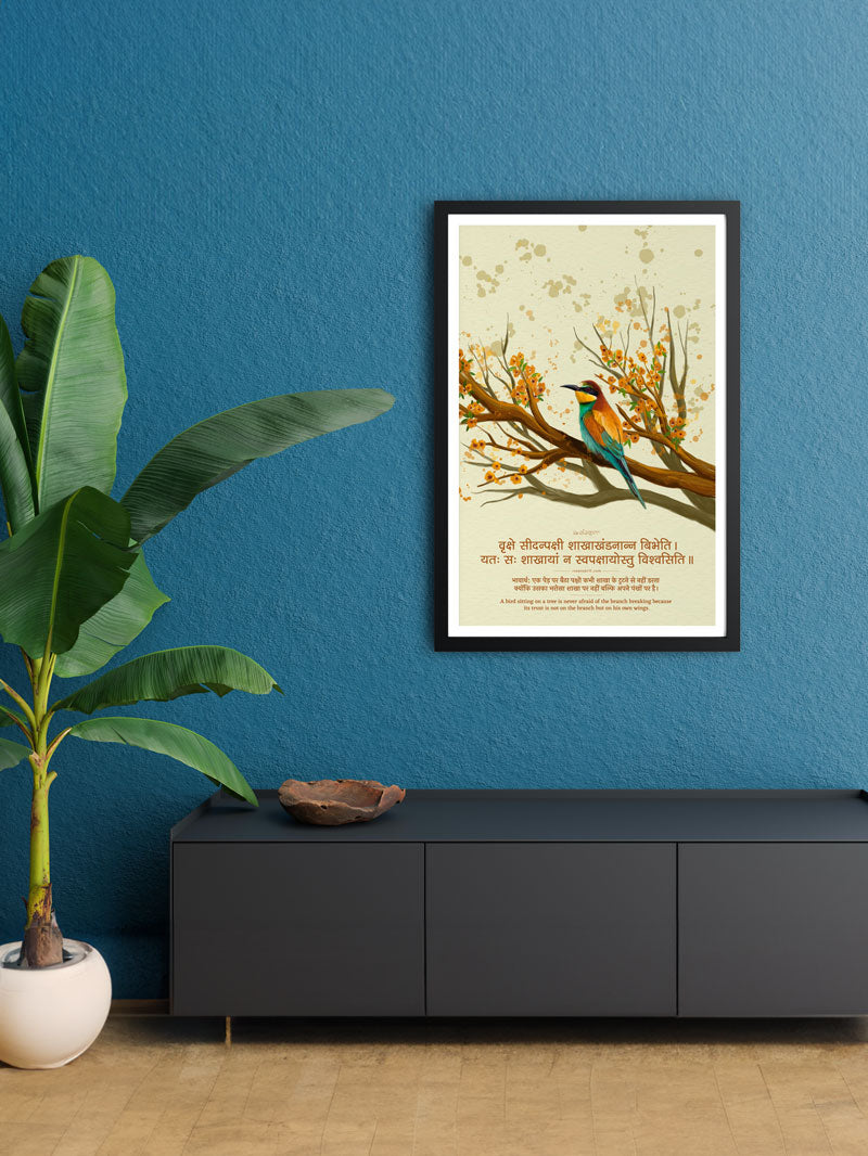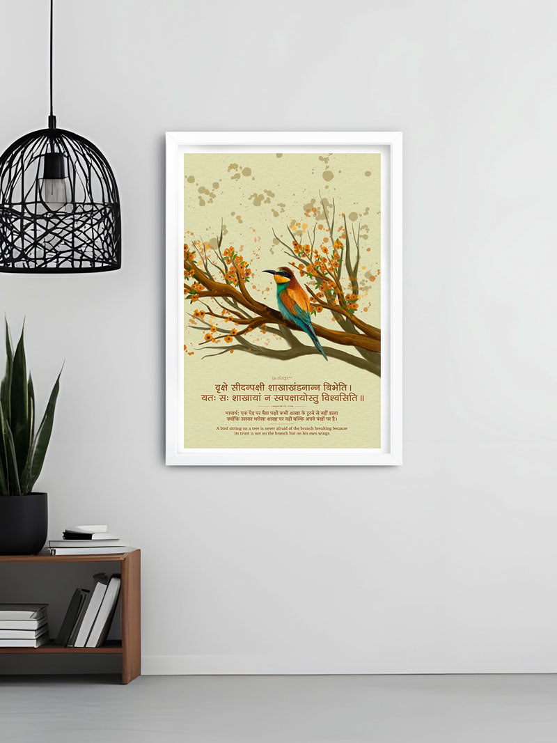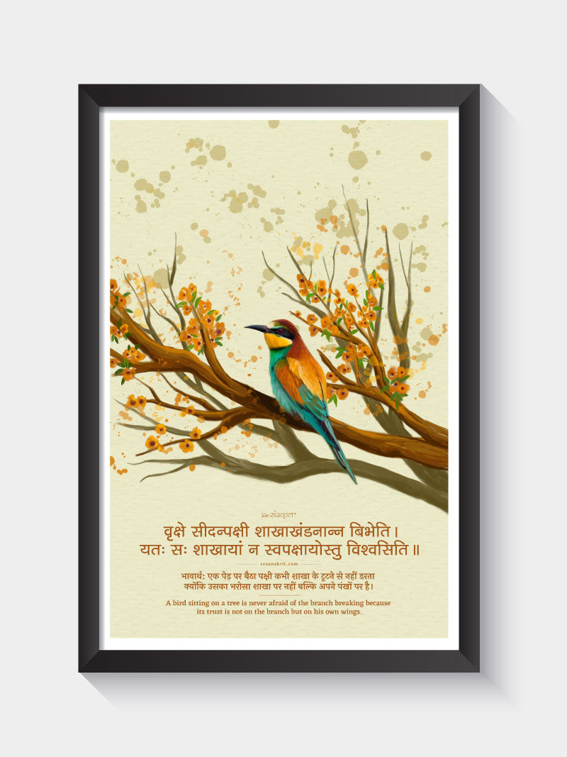 भावार्थ: एक पेड़ पर बैठा पक्षी कभी शाखा के टूटने से नहीं डरता क्योंकि उसका भरोसा शाखा पर नहीं बल्कि अपने पंखों पर है।