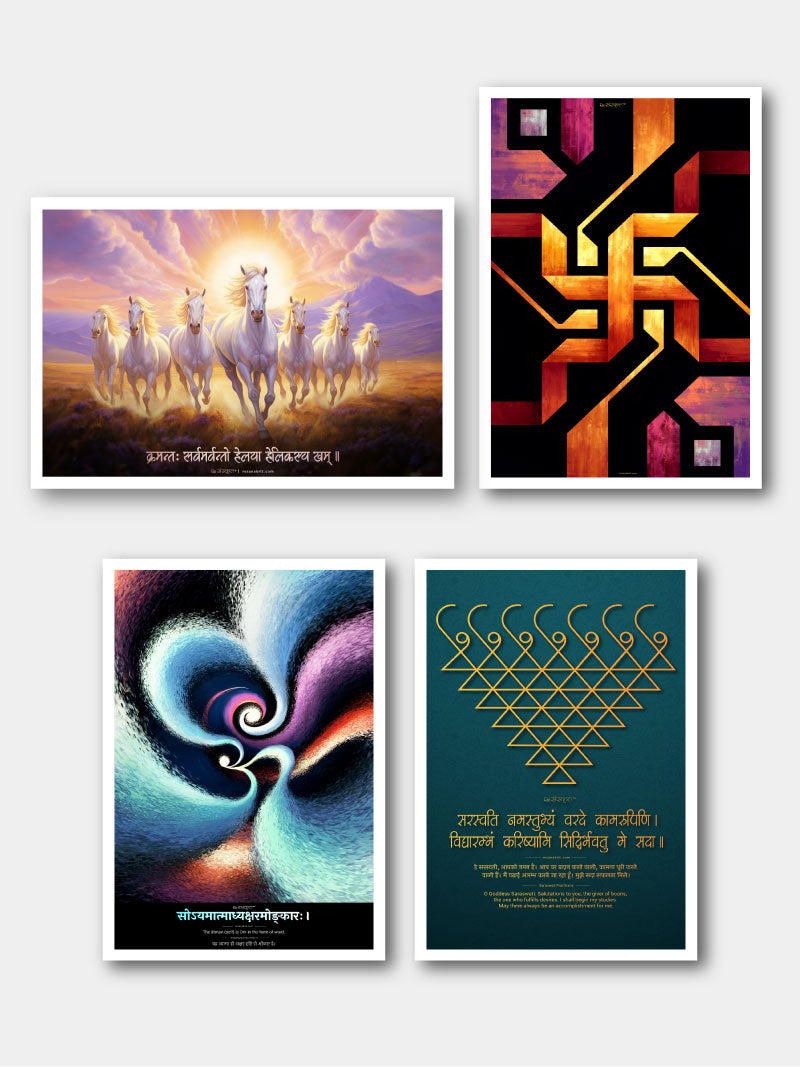 Elevate your space with this 4-poster Sanskrit combo inspired by Vastu, sacred geometry, and divine symbolism. Ideal for home entrances, meditation zones, and spiritual interiors that channel positive energy.