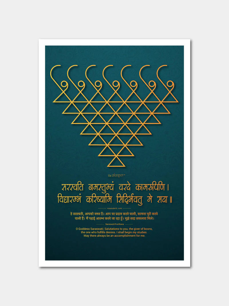 हे सरस्वती, आपको नमन है। आप वर प्रदान करने वाली, कामना पूरी करने वाली हैं। मैं पढ़ाई आरम्भ करने जा रहा हूँ। मुझे सदा सफलता मिले।