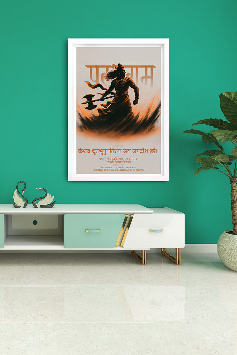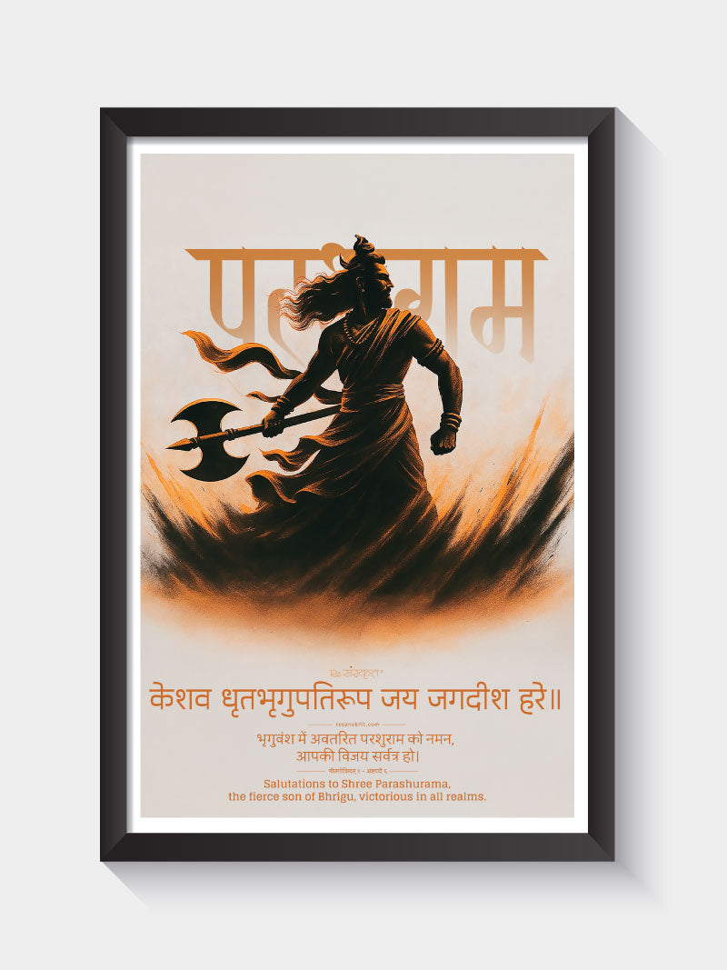 Celebrate Shree Parashurama’s divine valor with this beautifully framed Sanskrit artwork. The verse “केशव धृतभृगुपतिरूप जय जगदीश हरे” hails his powerful form and mission. Ideal for traditional interiors and spiritual spaces that honor Vedic strength and discipline.